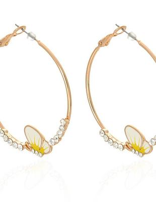 Сережки 960610 Красиві та незвичайні сережки виготовлені у формі кілець і прикрашені фігуркою метелика. Вони доповнять безліч образів у таких стилях: вечірньому, повсякденному, романтичному та класичному. Прикраса підійде кожній дівчині, незалежно від її віку, кольору волосся та форми обличчя. Воно чудово поєднується з діловими костюмами, простими джинсами, вечірніми пишними платтями та легкими блузами. Сережки додають луку особливого шарму та лоску, підкреслюють красу та ніжність шкіри. Дизайн цієї моделі лаконічний, але водночас цікавий. Вона доповнена білими стразами, які зачаровують і переливаються в променях сонця. Для ширшого вибору основа виробу виготовлена у двох кольорах: золотистому та сріблястому. Зручна та якісна застібка надійно фіксує й утримує аксесуар упродовж усього дня. Товарна одиниця виготовлена з міцного та високоякісного металу, який вирізняється довгим терміном експлуатації та стійкістю до різних пошкоджень. Матеріал не тьмяніє, не окиснюється під час контакту з водою, водночас є повністю безпечним в експлуатації. Виріб легкий, не відтягує мочку вуха та не ушкоджує місце проколювання. Атрибутом практично неможливо травмуватися. Аксесуар не сковує й не обмежує рухів, не чіпляється за одяг. Його можна носити з ранку до вечора, не відчуваючи найменшого дискомфорту та болю. Догляд дуже простий і швидкий.