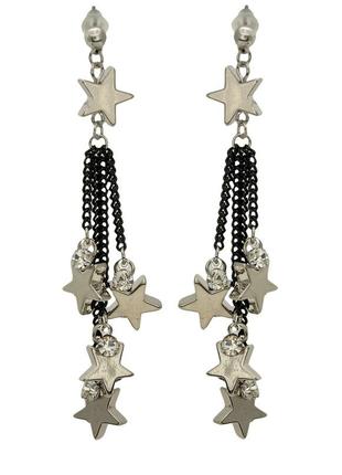 Сережки 964102 Стильні сережки-цвяшки потішать модниць, які люблять експериментувати зі своєю зовнішністю, доповнюючи щоденні, святкові, ділові комплекти ефектною біжутерією. Подовжена модель із чорними ланцюжками, прикрашеними мініатюрними зірками зі стразами, розставляють правильно акценти в будь-якому образі, підкреслюючи жіночність і романтичність. Виготовлені яскраві деталі з якісного металу, який упродовж довгого періоду не втрачає своєї привабливості. Матеріал виробу не іржавіє, не деформується, стійкий до стирання, розтріскування, розломів. Прикраса з якісною застібкою представлена в золотистому та сріблястому виготовленні. Сережки добре тримаються впродовж дня, позаяк кріплення забезпечує надійну фіксацію. Під час носіння виключені дискомфортні відчуття. За блискучою прикрасою легко доглядати. Воно легке, повітряне, не відтягує мочку вуха, має ефектний вигляд з білими, темними локонами. Компактну біжутерію можна завжди носити із собою в косметичці, щоб у будь-який час доповнити образ шикарним аксесуаром.
