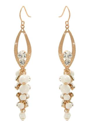 Сережки 848903 Неймовірно гарні сережки з недрагоцінного сплаву металу приковують погляд і зачаровують з перших секунд. Аксесуар, прикрашений сяйними стразами та намистинами, складається з декількох частин. На гачку-петлі прикріплений блискучий металевий елемент у формі еліпса, всередині якого розміщені два кристали різного розміру. До овалу за допомогою маленького кільця прикріплена декоративна підвіска у формі грона намистин і стразів. Вся композиція плавно гойдається під час граціозних поворотів голови. У каталозі представлені кілька варіантів виконання: сріблястого або золотистого кольору основа, з білими або чорними намистинами на вибір. Така різноманітність дає змогу підібрати сережки, які не вибиватимуться за стилем з решти біжутерії. Аксесуар ідеально підходить до вечірньої сукні або святкового образу. Також можна надіти його з не надто строгим костюмом — сережки додадуть жіночності діловому одягу. Прикраса великого розміру не важка, і не відтягуватиме мочки вух. Метал не втратить блиску, а стрази та намистини не розгубляться згодом. Сережки притягатимуть заворожені погляди та слугуватимуть господині дуже довгий час. Аксесуар чудово підійде дамам будь-якого віку та соціального статусу.