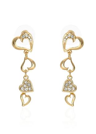 Сережки 10473 Сережки у формі сердець — це чудове рішення для створення незабутніх святкових образів, ділових і щоденних. Упевнені в собі жінки намагаються регулярно використовувати різноманітні прикраси, щоб підкреслити жіночність і екстравагантність. Декороване виріб ажурними сердечками в кількості чотирьох штук, які всипані мініатюрними блискучими стразами білого кольору. Камушки під час світла переливаються різними гранями, привертаючи увагу оточення. Стилістика прикраса романтична, чудово гармонує з тонкою жіночою шиєю. Обтічний виріб із блискучими кристалами ідеально підкреслить коктейльне, повітряне вбрання. Основа моделі золотиста. Ланцюжок із сяйливих сердець під час кожного руху погойдується, залучаючи вляди милим поблискуванням. Сережки, завдяки якісним застібкам, не випадуть із мочки вуха в найневідповідніший момент. Можна доповнювати блискучою композицією плаття з відкритим декольте або з коміром-стійкою, також офісне вбрання, що складається з білосніжної сорочки та чорного костюма. Для представниць прекрасної статі, які люблять експериментувати з образами, сережки із сердечками будуть знахідкою.