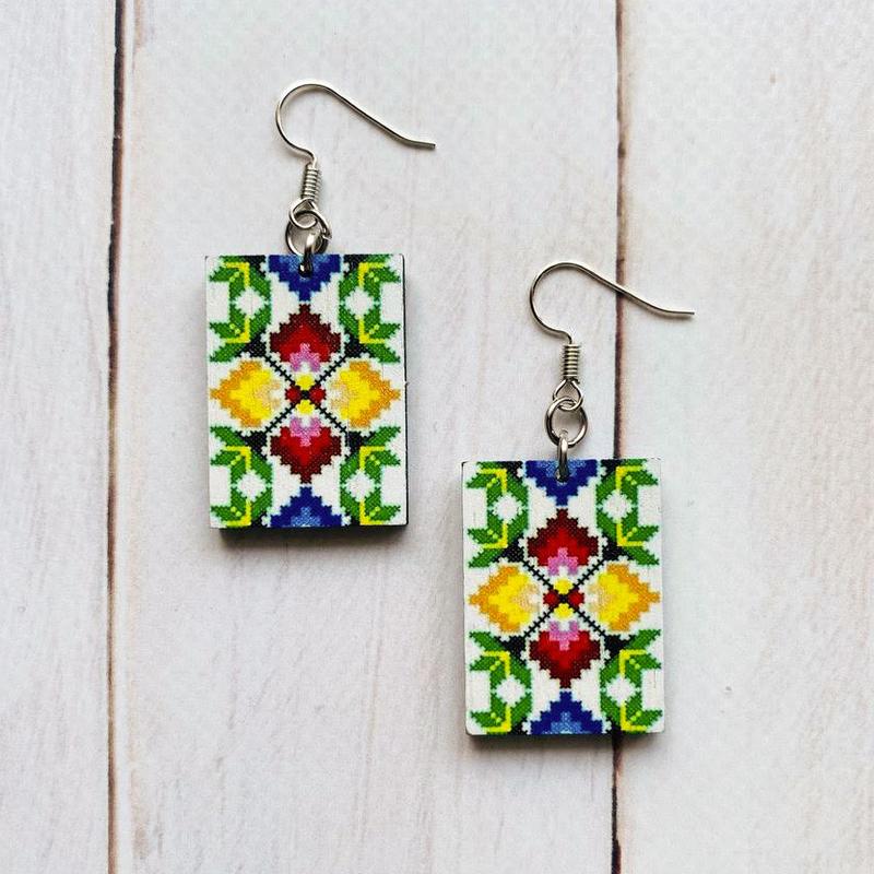 Тренд 2023 року. Вишукані дерев'яні сережки. Для справжніх шанувальниць красивого та стильного. Матеріал основи — дерево. Природна структура дерева підкреслює оригінальність прикрашання. Сторона сережок — 20 мм. Висота з кріпленням — 45 мм. Товщина основи — 3 мм. Принт рельєфний, стійкий до стирання та вицвітання, нанесений з двох боків сережки. Сережки легкі та зручні для носіння. Вага однієї сережки — 3 грами.