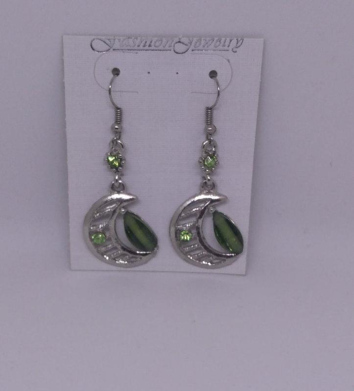Жіночі сережки довгі сріблясті кольори у формі місяця з зеленими стразами