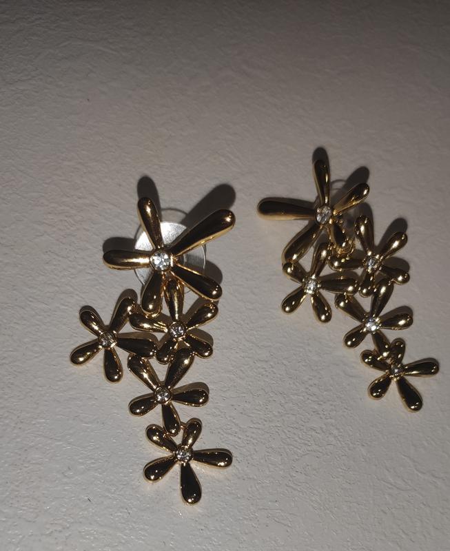 Святкові позолочені сережки "Розсип квітів" У центрі кожної квітки білий камінчик Довжина 4,8 см. Ширина 2,5 см. Спосіб кріплення — гвоздики з прозорим фіксатором.