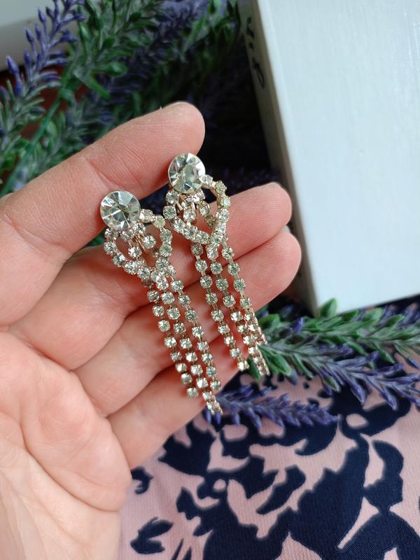 вишукані сережки на випускний, весілля, свято б/у одягались 2 рази застібка - еліпса внизу однієї сережки не вистачає одного камінчика ( не дуже помітно на загальному фоні) стан хороший оплата на карту накладеного платежу немає відправка укр та новою поштою