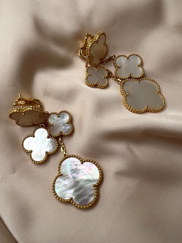 Сережки ванкліф з білим малим і великим конюшиною, позолота 18к (можна набором)