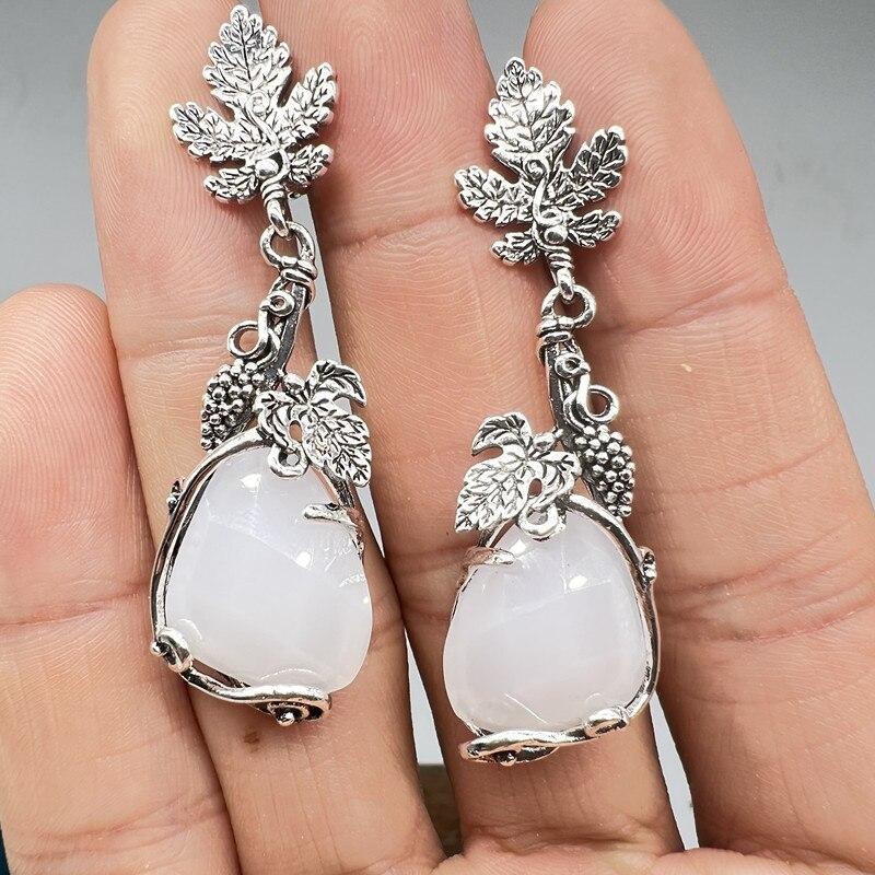 Сережки в ретро стилі з білим каменем сріблястого кольору у вигляді виноградної лози