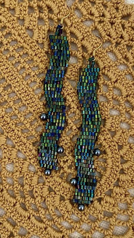 Сережки «Таємниці Почайни» Створені з японського бісеру, оздоблені чеськими намистинами, фурнітура – латунь з позолотою 14k Висота сережок 8,5 см (без швензи) Ширина 1,5 см (в найширшій частині)