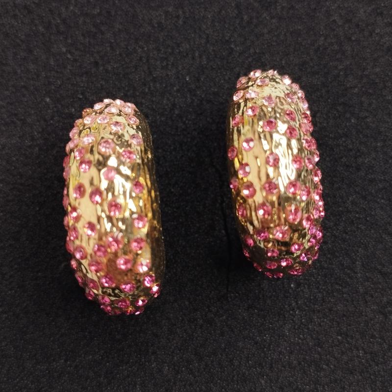 Великі ошатні сережки. Метал в золотому тоні. Прикрашені рожевими кристалами. Відмінний стан, втрат та потертостей немає. Якісна біжутерія, важкенькі. Заміри на фото.