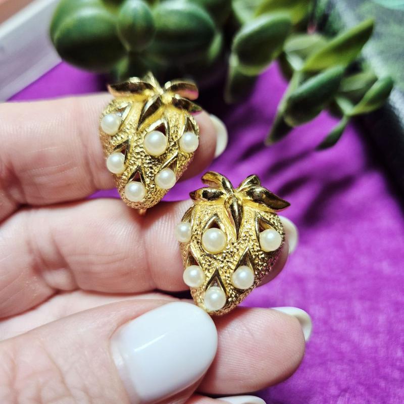 Дивовижної краси вінтажна прикраса від легендарного американського бренду TRIFARI (перша пол.60-і роки ХХ століття). І у відмінному стані! Обережно! Ці неперевершені полуниці можуть вразити у самісеньке серденько. Золотиста основа, ажурна форма, декор у вигляді намистин - штучні перлинки. Розмір - 1,8 х 2,4 см. Доданий відеоогляд.