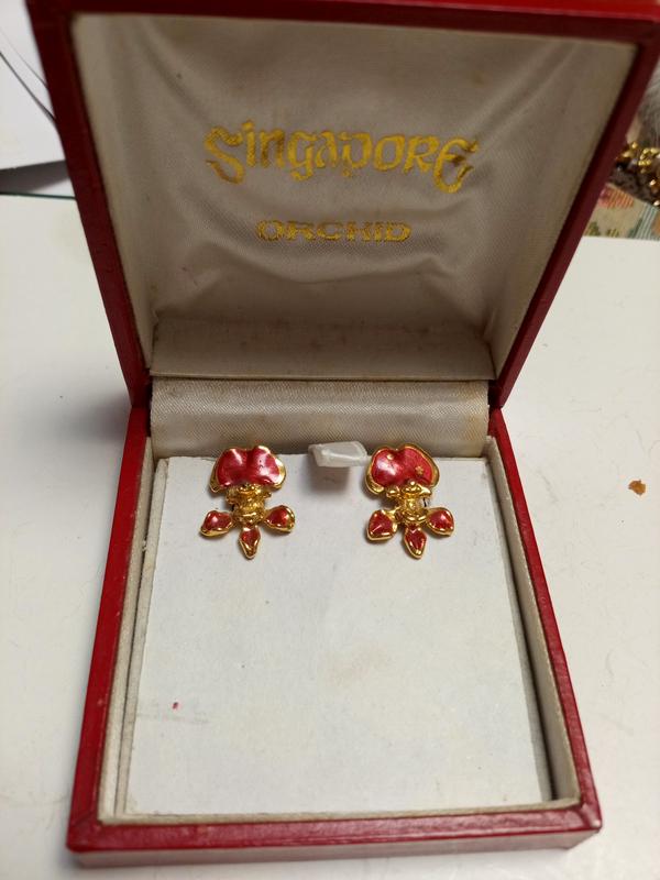 в родной коробке, винтаж, Сингапур покрытие 24 каратное золото, эмаль клипсы