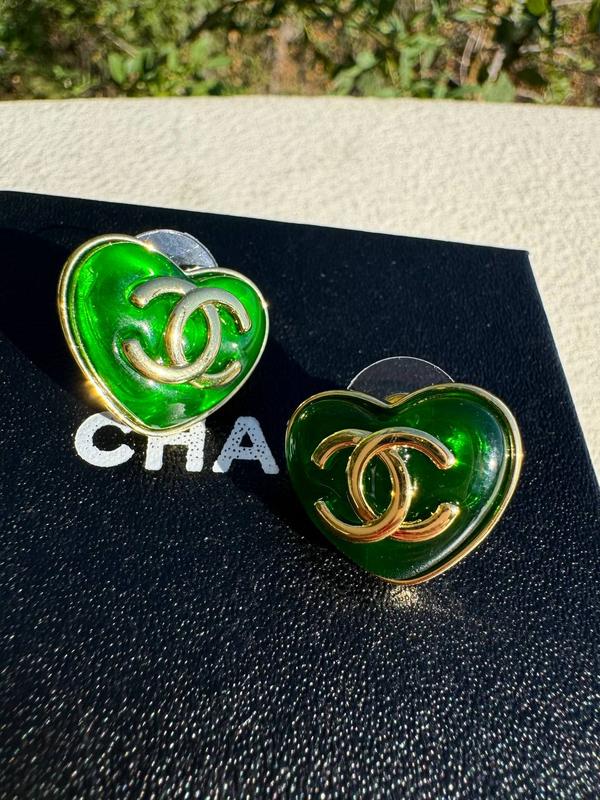 Стильные серьги шанель сердечки зеленые с декором в виде логотипа / позолота 18к
