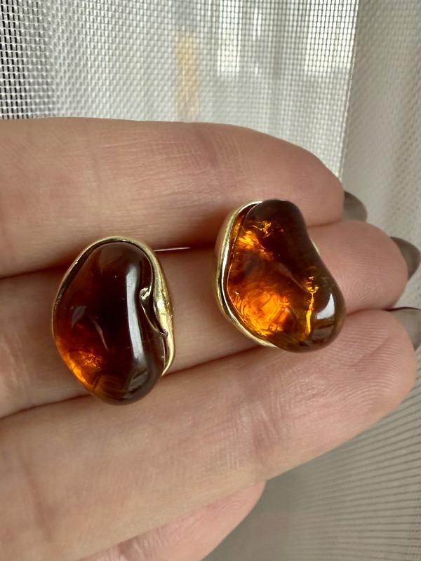Елегантні сережки-гвоздики «Медовий Янтар» — ідеальний акцент для щоденного та святкового образу. Насичений янтарно-медовий відтінок, який при зміні освітлення грає теплими тональними переходами — від глибокого коньячного бурштинового до прозорого золотистого сяйва. Огранка: елегантне під золото покриття на гіпоалергенній основі. Легкі, комфортні для тривалого носіння.