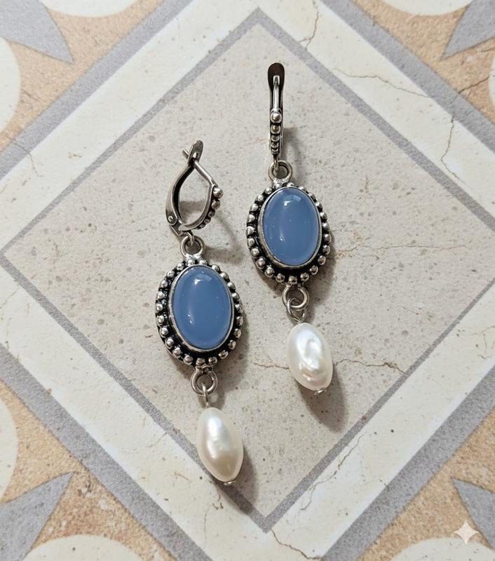 Чарівні перлинні срібні сережки з натуральним халцедоном. Довжина сережки — 5,5 см. Зручний англійський замок. Мають дуже красивий вигляд.