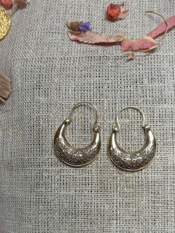 Сережки лунниці. Можливо походять від середньовічних лунничних колтів. Етнографічно відомі на території України від часів козацтва. матеріал: латунь або олов’яний сплав розмір: 3,6х2,7 см. вага одної сережки 7,5 гр.