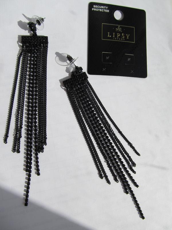 Шикарные серьги-подвески для особого случая. Черные камни в сочетании с цепочками того же цвета выглядят стильно и элегантно. Длина сережек без ушка 12 см.
