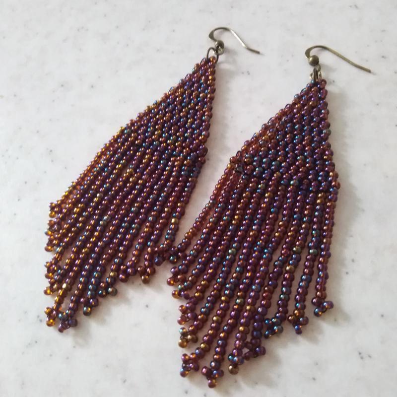 Грайливі сережки з чеського бісеру довжиною 10 см, шириною 2,2 см.