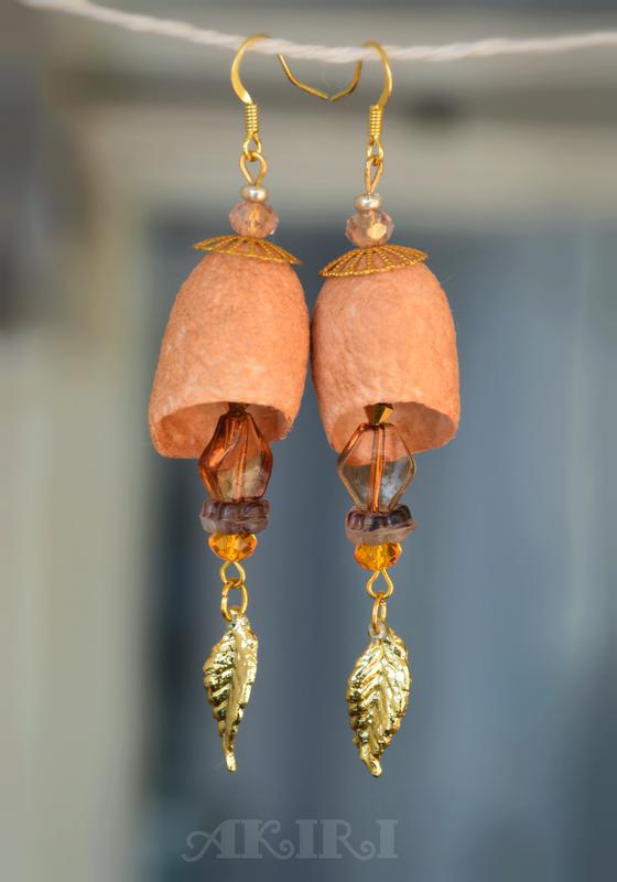 Матеріали: кокони шовкопряда, намистини з чеського скла, акрилові намистини, фурнітура під золото, підвіски-листочки, швензи