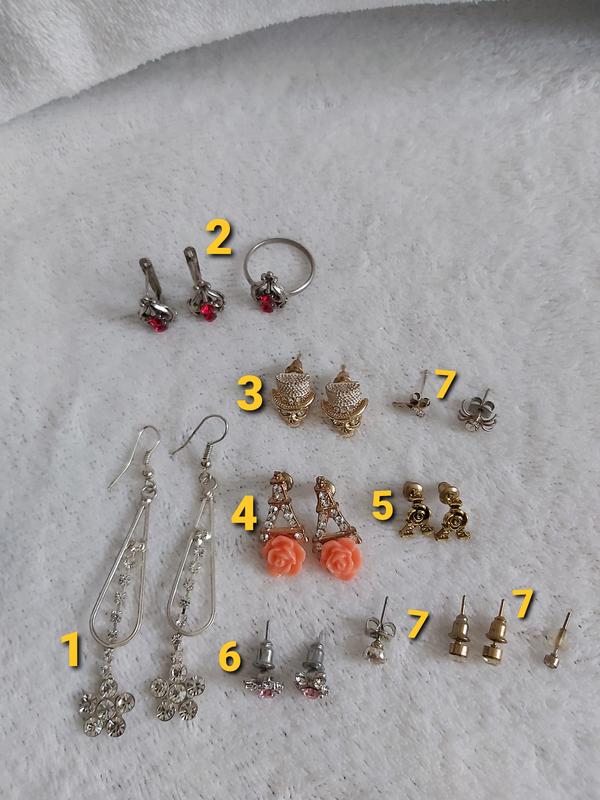 Сережки: 1.Сережки з камінням квіти - 30грн. 2.Набір (сережки+кільце) - 100грн. 3.Сережки череп - 30грн. 4.Сережки Париж з квітами - 30грн. 5.Сережки Париж - 20грн. 6.Сережки зайчики - 20грн. 7.Сережки цвяхи - пара - 10грн, 1шт. - 5грн. Ще є дуже багато цікавого на сторінці👗👓👖👕🩳👚👟💍📿🧤))) Welcome!!! 🛍 НА ЧАС ВІЙСЬКОВОГО СТАНУ З БЕЗПЕЧНОЮ ОПЛАТОЮ НЕ ПРАЦЮЮ💙💛!!! При покупці від 3-х товарів отримуєте додаткову знижку %%% 🛍🥰🌷🇺🇦