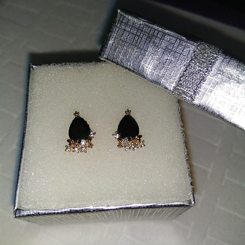 Матеріал: мед. золото. Колір покриття: позолота. Вставка: чорні кристали в квітково-цирконієвому обрамленні. Застібка: гвоздики(пусети). Виробник: Xuping.