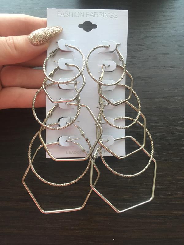 6 пар сережек серебряного цвета,диаметр самой маленькой-2,5 см 2,5 см 3,0 см 4,0 см 4,0 см 4,5 см