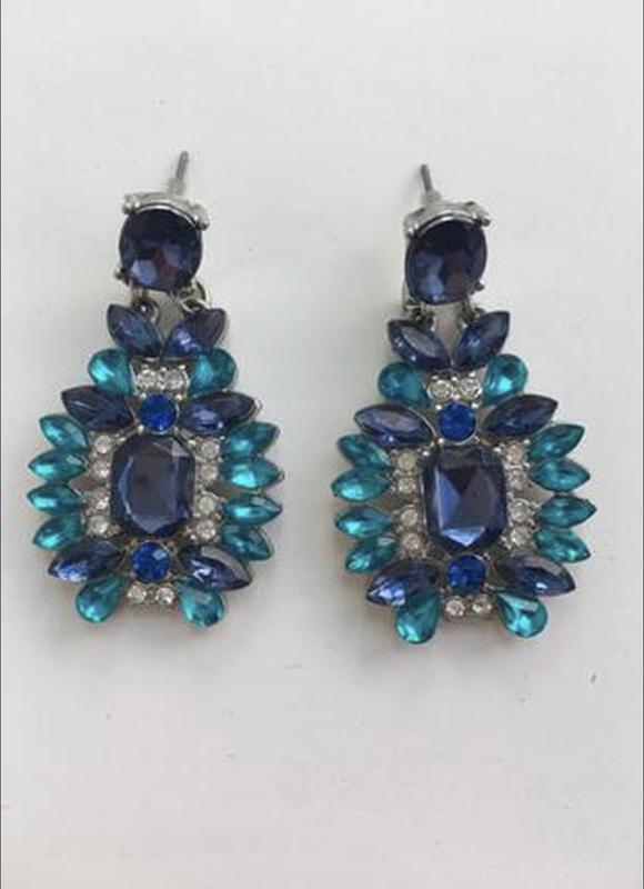 Красивейшие серьги с синими, бирюзовыми и белыми камушками. Смотрятся очень красиво в ушах. Подарили, носила раза два, так как стиль не мой немного)