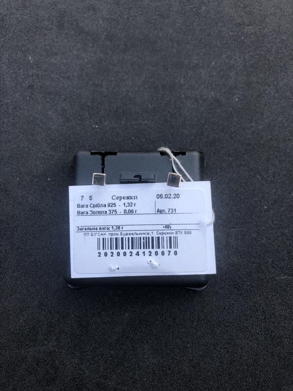 Сережки «гвоздик» з позолотою Маса виробу 1,38 гр Маса срібла 1,32 гр (срібла 925) Маса золота 0,06 гр (375 золота) Ціна виробу 210 грн