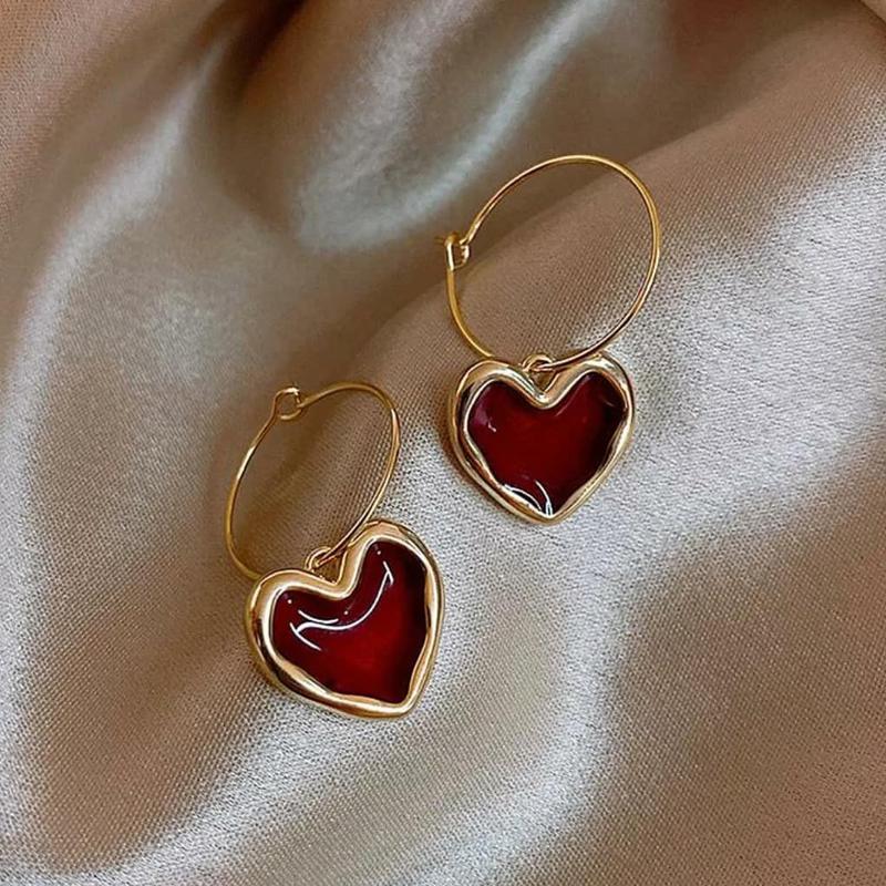 Неймовірно ефектні і стильні сережки кільця з підвісками серце з червоної емалі. Розмір: колечко-2см, сердечко-1.5 см Колір: огранювання-золото, серце-червоне. Склад: бижутерный сплав+емаль.