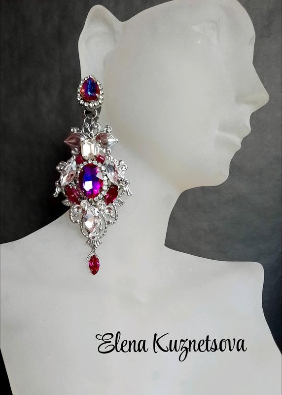 Модные объёмные серьги. Полностью ручной работы! Длина сережек примерно 9 см. Выполнены из металлической филиграни, стеклянных кристаллов, хрустальных бусин.