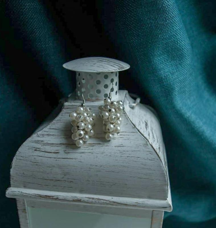 Білі сережки грона з пластикових бусин під перли. Приємне і ні до чого не зобов'язує прикраса. Зроблені були на одному диханні))