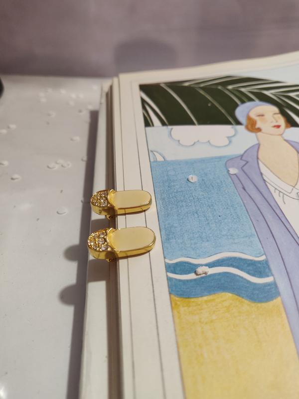 Кліпси у вигляді капців,емаль молочного кольору,оздоблені стразами. В ідеальному стані з рідною планшеткою до літа.