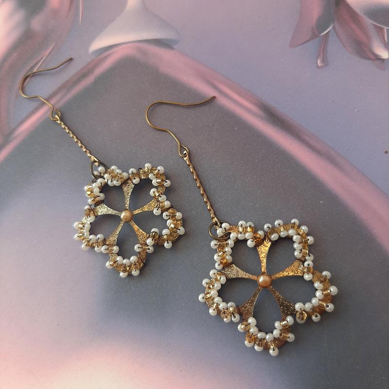 Серьги длин цветок сережки бисер плетен бісір висюльки золот бохо