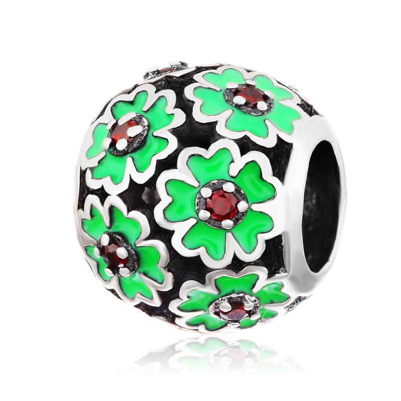 Барвистий шарм з зеленими квітками і червоними серединками, основа срібло 925 проби