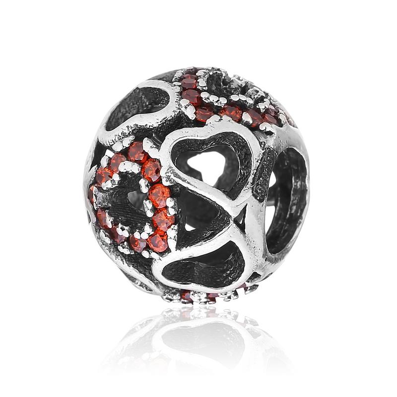 Круглий шарм з сердечками з червоних каменів, основа срібло 925 проби