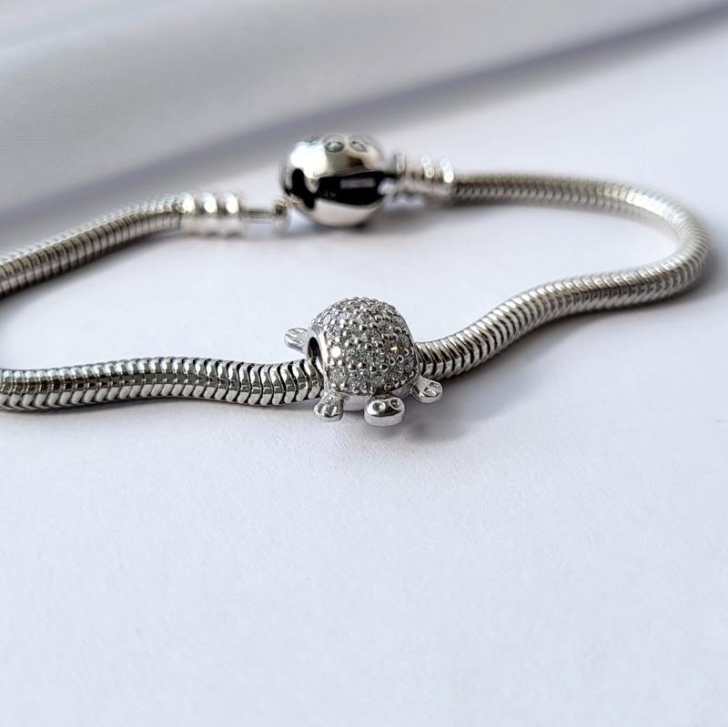 Серебряный шарм Черепашка Серебро 925 пробы Родированное серебро Вес 1.35г Вставка камешки цирконы белого цвета Размер шарма 10 × 14 мм Производство Украина На Всех ювелирных изделиях стоит проба палаты Украины подтверждающая материал изделия- и законность их реализации на территории Украины и именник производителя, который гарантирует соответствие ювелирных изделий требованиям ГСТУ 3527-97 "Изделия ювелирные из драгоценных материалов