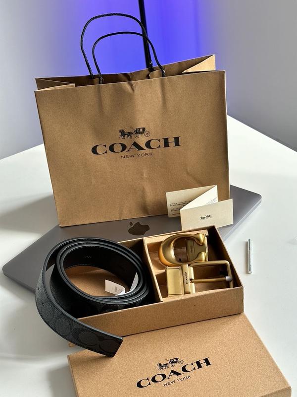 Ремінь Coach Belt Kit Gold Fittings Матеріал: Шкіра Розмір: 118-3,6 см Є можливість зробити додаткові отвори під необхідний розмір. Комплектується у брендованій коробці Coach, є пакетик та буклетик.