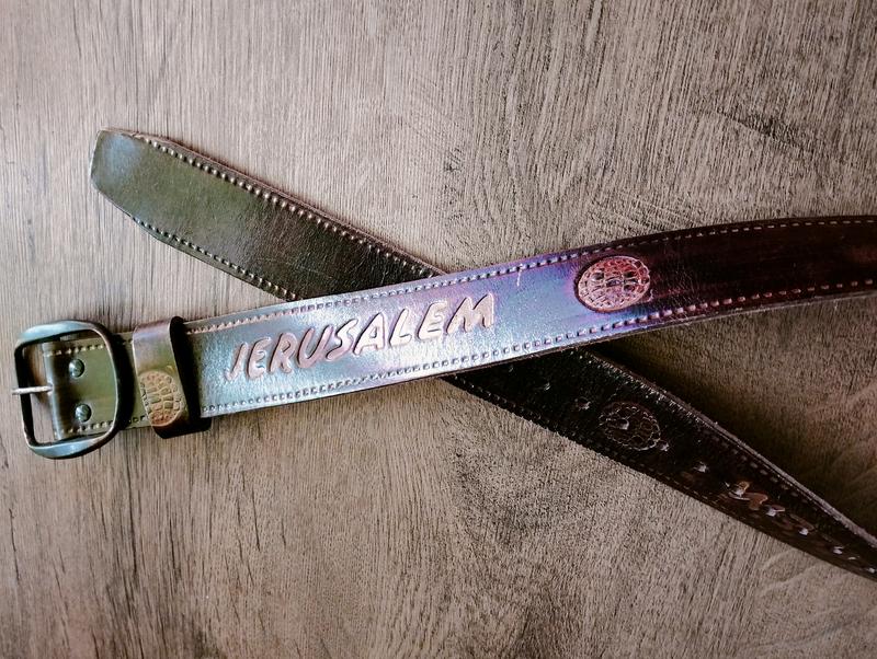 широкий чоловічий ремінь з натуральної шкіри з тисненням Jerusalem, міцний, дуже красивого кольору, довжина 115, ширина 4,5, стан ідеальний