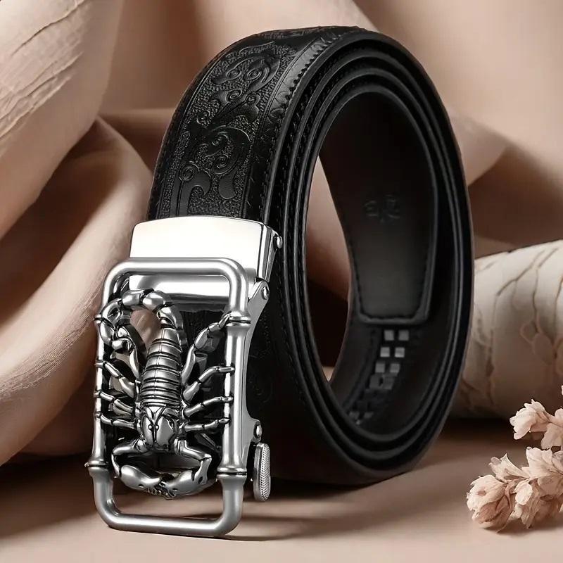 Мужской кожаный ремень с узором черного цвета, имеет металлическую автоматическую пряжку со скорпиометром блестящего серебристого цвета.