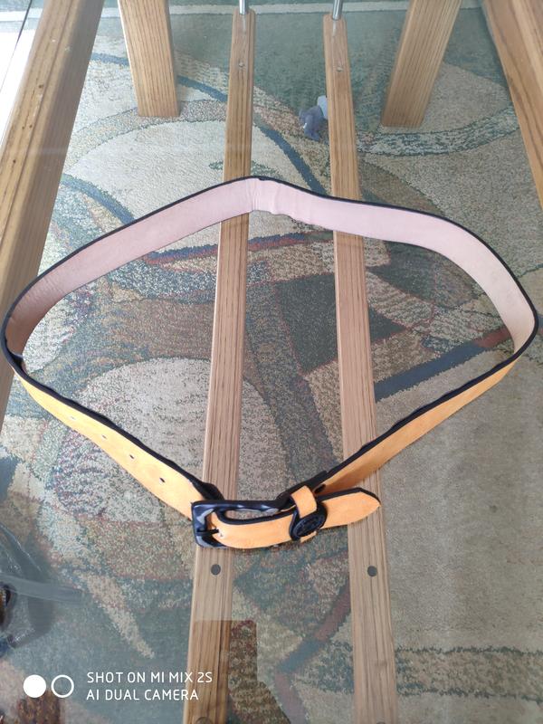 Кожзам. Зовні стан дуже гарний. З внутрішнього боку злегка відшарувалася тканина😏 Довжина 109 Ширина 3.5 Пряжка 6.5 на 5.5 Подарунок до будь-якої купленої речі.