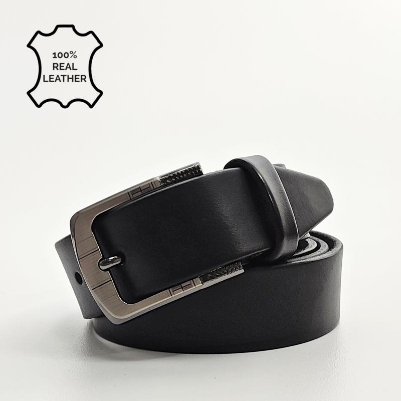 Черный брючный кожаный ремень 3,5 см Мужской классический черный ремень - это необходимый и незаменимый аксессуар к хорошему костюму или брюкам. Кожаный классический ремень это дополнения Вашего идеального образа. Невозможно представить себе серьезного делового мужчину в классических брюках и без ремня. Если Вам нужен добротный мужской ремень под брюки или костюм, рекомендуем обратить внимание на эту модель. Ремень выполнен из качественной натуральной гладкой кожи и оснащен металлической классической пряжкой с лазерной гравировкой. Прекрасный вариант для подарка дорогому человеку.