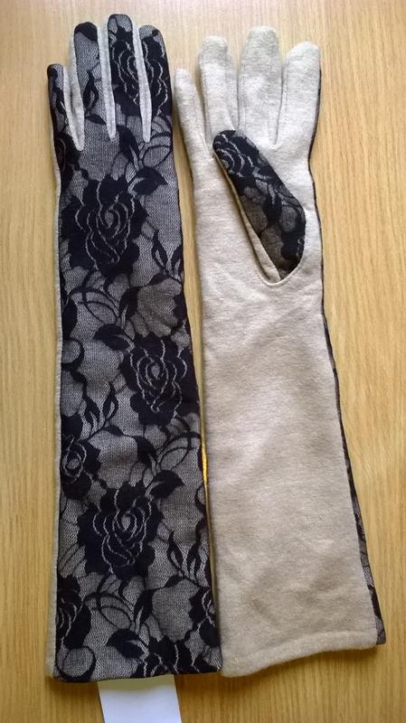 Шикарні довгі теплі рукавички р. l з мереживними вставками, бежеві богемний шик