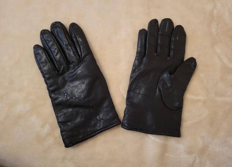 Жіночі шкіряні рукавички. Рoзм.7,5 М'яка натуральна шкіра чорного кольору. Утеплені. На внутрішній стороні місцями розпушена в'язка (фото). В іншому - ідеальний стан. Довжина середнього пальця - 7,5 см, великого - 6 см. Довжина рукавички від середнього пальця - 22 см. Ширина під великим пальцем - 10 см