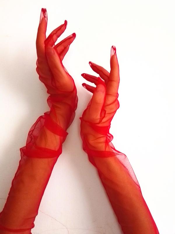 Довгі фатинові рукавички у червоному кольорі. Тканина сітка стрейч. Довжину рукавичок можна регулювати. У наявності також у чорному /білому/бордовому/пудровому кольорі. Також у наявності є шкарпетки з сіточки у таких же кольорах. У наявності є блискучі рукавички,мітенки (рукавички без пальчиків), бархатні рукавички, рукавички з крильцями. Рукавички без бренду!