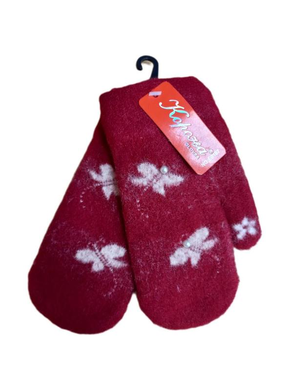 Рукавички дитячі зимові для дівчинки 5-7 років Корона бордові Дитячі рукавиці для дівчинки 5-7 років, бордового кольору. Легко одягаються, мають резинку, що фіксує, на зап'ястя. Рукавиці добре комбінуються з верхнім одягом. Розмір універсальний Склад: 40% вовна, 35% бамбук, 25% спандекс
