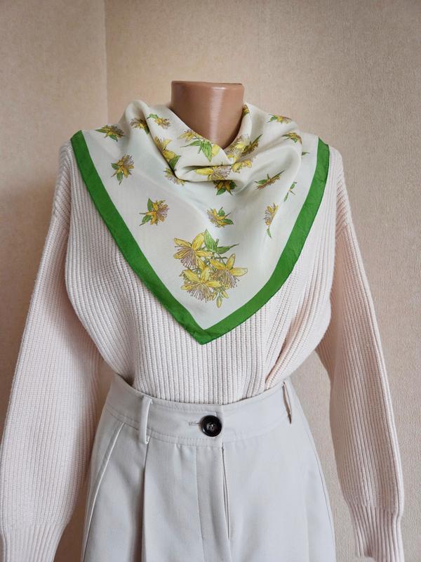 Шовкова хустка бандана, натуральний шовк з цікавим принтом зверобій. Як бандана на голову, на шию або як прикраса на сумку. Є невеличка дирочка ≈ 0,01см (останне фото). Інших нюансів немає. Розмір 49×49 см