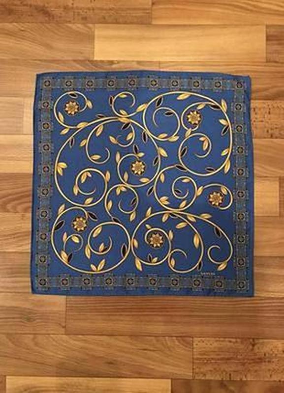 Елегантна хустка відомого бренду Lanvin з натурального атласного шовку. Особливості: • Розмір: 39×39 см • Матеріал: дорогий атласний шовк • Колір: синій з золотистим орнаментом • Стиль: гавроші • Обробка: якісний шов (не роуль) • Стан: ідеальний, без дефектів Вишуканий візерунок у вигляді золотистих завитків та листочків на глибокому синьому тлі створює розкішний вигляд. Хустка підкреслить будь-який образ та додасть нотку французького шику. Ідеально підходить як аксесуар до сукні, блузи або як стильний акцент у волоссі.