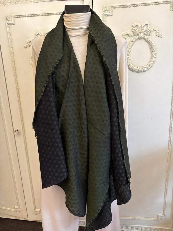 Склад:вовна/шовк(80/20). Великий двосторонній палантин. Кольори :чорний/темно-зелений). Визерунок-в горошок. Розмір:180х68 см. Стан нової речі.
