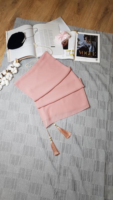 Цікава шифонова шаль кольору курній троянди з милими пензликами. Склад не вказано, але швидше за все, це поліестер. Оригінальна штучка під пальто чи піджака. Стан прекрасний. Заміри: Довжина - 166 см Ширина - 70 см