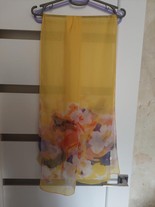 легка хустина шарф, стан дуже хороший, 40% шовку з лдного боку є невелика затяжна на фото. дуже ніжна, колір доволі насичений, yelin виробник розмір 50*150 см