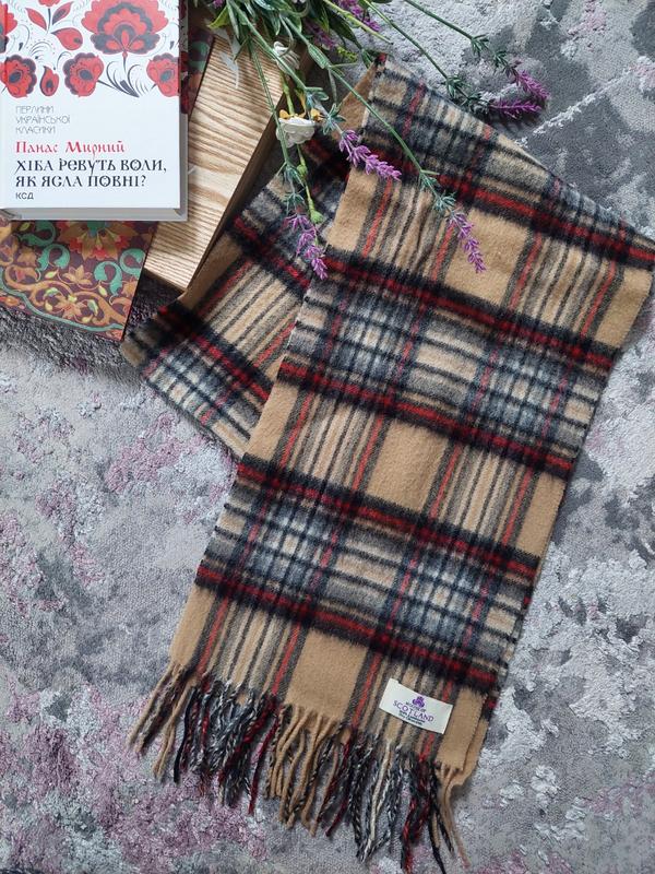 Шотландский шерстяной бежевый шарф в принт тартан house of scotland(25 см на 172 см)