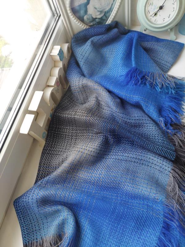 Велика тепла хустку в сіро - блакитних тонах ,можна пов'язати так, що б було більше блакитного або сірого кольору .Є кілька зачіпок і ледь помітна цятка .Розмір 140 Х 130 .